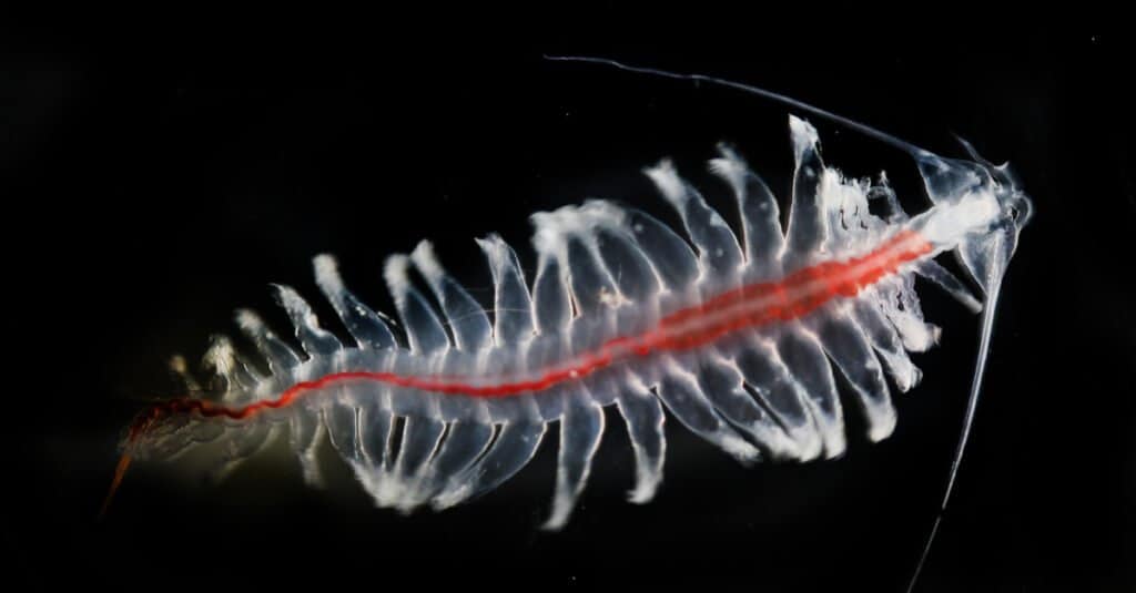 I krill sono minuscoli crostacei marini, la maggior parte dei quali misura non più di un pollice o due di lunghezza. Sono prede molto comuni per organismi marini più grandi come le balene, che li spazzano via a migliaia. Questi organismi poco appariscenti hanno anche la straordinaria capacità di produrre luce dai loro corpi. Alcune specie hanno persino una speciale lente girevole per dirigere la luce verso un’area specifica. La ragione dietro questo non è chiara. Potrebbe avere qualcosa a che fare con l’accoppiamento o il comportamento scolastico.