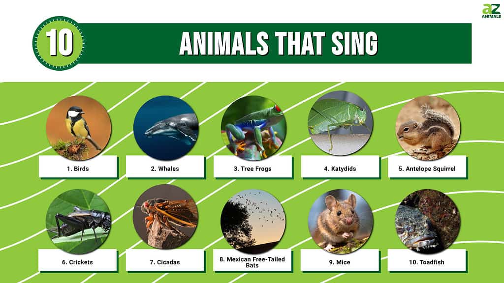 La maggior parte delle persone sa che gli uccelli sanno cantare. Puoi sentire gli uccelli cantare passeggiando per il tuo quartiere o tenendo certe specie come animali domestici. Ma sapevi che anche molti altri tipi di animali cantano? Dai un’occhiata alla nostra lista qui sotto per alcuni musicisti inaspettati tra mammiferi, anfibi, acquatici e invertebrati.