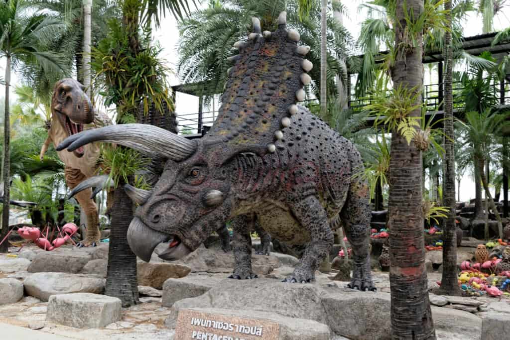 Essendo uno degli animali con il teschio più grandi del mondo, il Pentaceratops aveva un teschio alto fino a 10 piedi (3 metri). Erano un grande membro della famiglia Ceratospidae, che cresceva di circa 25 piedi (7,62 metri) di lunghezza. Il Pentaceratops è noto per il suo grande cranio dotato di 5 corna. Pochi fossili di questo dinosauro sono stati scoperti e la maggior parte è stata trovata nel San Juan New Basin nel New Mexico.