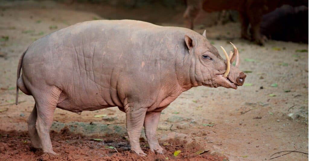 La ricerca attuale suggerisce che i maiali – di cui fa parte il babirusa selvatico – potrebbero essere i secondi parenti terrestri più vicini al delfino dopo gli ippopotami. Ma non c’è dubbio che questi animali abbiano perso i capelli molto tempo dopo le loro controparti acquatiche. Nonostante ciò, le ragioni sembrano essere in gran parte simili. Sembra invece che abbiano sviluppato strati di grasso extra per isolarli meglio dal calore, e si rotolano anche nel fango per aiutare a regolare la loro temperatura proprio come gli altri maiali. Ma la caratteristica più singolare della babirusa sono le sue imponenti zanne che le hanno valso l’appellativo di “cervo-maiale”. La teoria prevalente è che queste zanne siano state sviluppate non come arma ma come difesa per proteggere il volto dei maschi.