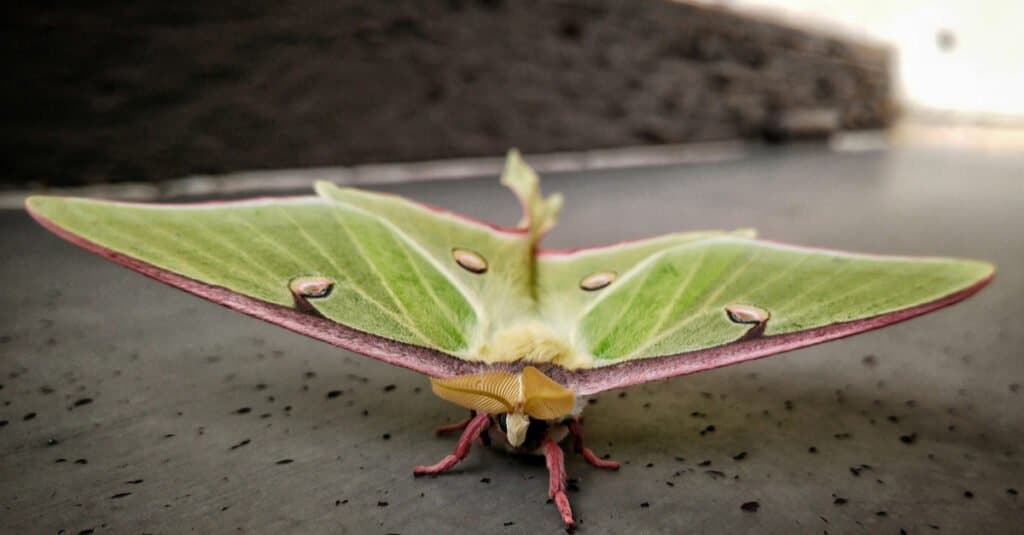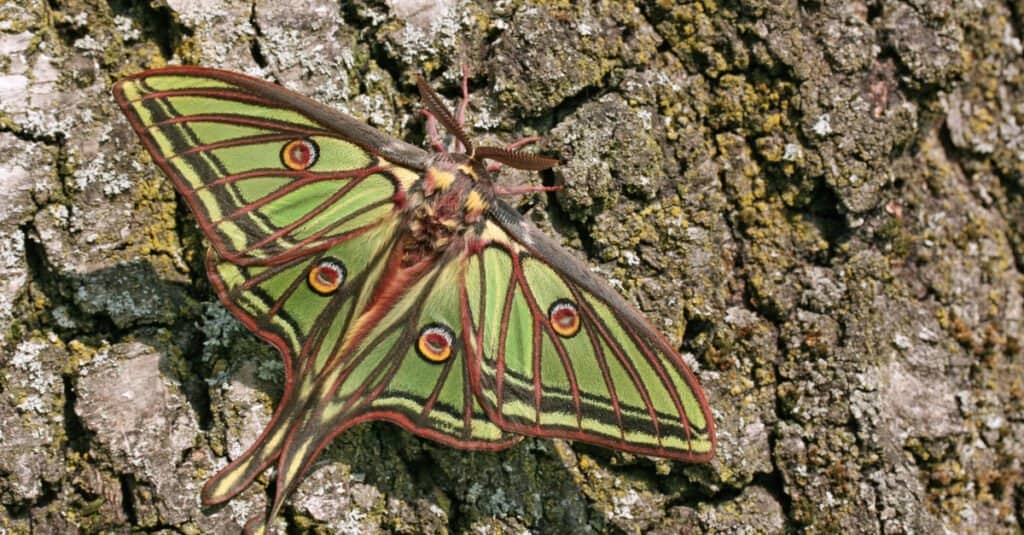 Una delle falene più belle della terra, la falena luna vive per così poco tempo, una settimana al massimo, che non si preoccupa nemmeno di mangiare. Si tratta di accoppiarsi, deporre le uova e creare più falene lunari. È una grande falena, con un’apertura alare da tre a 4,25 pollici. Le sue ali sono di un luminoso verde lime pallido o blu-verde. Le ali anteriori sono bordate di marrone e un ocello è attaccato ad esse da una fascia marrone.