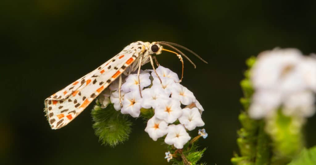 Come altri tipi di falene colorate, questa colorazione avverte i predatori che l’insetto ha un cattivo sapore. Il maculato cremisi ha un’apertura alare da 1,14 a 1,65 pollici e si trova in Europa, Africa settentrionale e Asia centrale in prati secchi, parchi e arbusti.