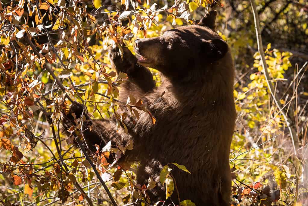 Nella foto sopra c’è un orso nero alla cannella che cerca i mirtilli nel tardo autunno per immagazzinare il grasso per l’inverno.