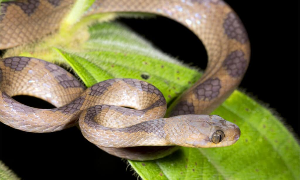 Il serpente arboricolo dalla testa smussata è un serpente leggermente velenoso con grandi occhi.
