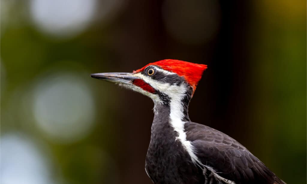 Il picchio pileato è per lo più nero con strisce bianche che vanno dalla testa alla gola. Ha una caratteristica cresta rossa sulla testa, che ricorda il suo alter ego dei cartoni animati, Woody Woodpecker. Puoi distinguere i maschi dalle femmine dalla fascia rossa che va dal becco alla gola. Nelle femmine, questa banda è nera.
