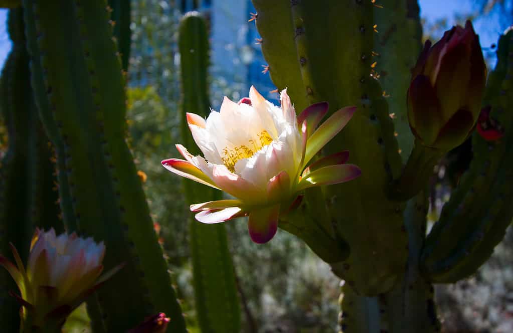 Il cactus San Pedro (Echinopsis pachanoi) è originaria delle Ande in Perù ed Ecuador. È stato usato per secoli dagli indigeni per scopi medicinali, spirituali e cerimoniali. Il cactus in genere cresce fino a 5 piedi di altezza, ma può raggiungere i 20 piedi di altezza con il tempo. Ha una forma cilindrica e spine verde-blu lungo il corpo. I suoi fiori sono di colore bianco o bianco-rosato e sbocciano di notte da giugno ad agosto. I fiori si aprono la sera e sbocciano solo per pochi giorni, quindi non perderti l’esposizione!