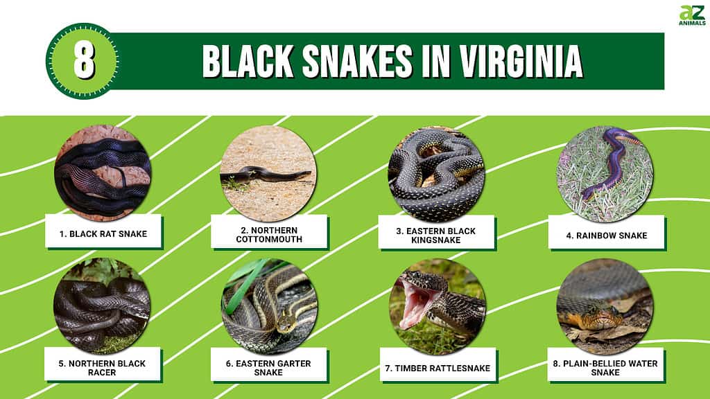 Tuttavia, comprendiamo che vedere un serpente nero può causare preoccupazione, soprattutto se si trova nel tuo giardino. In questa guida descriveremo in dettaglio 8 serpenti neri che potresti incontrare in Virginia. Per ciascuno di essi forniremo un’immagine e i dettagli se presentano o meno un pericolo immediato o sono velenosi. Immergiamoci!