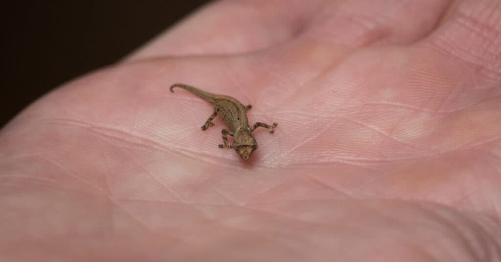 Brookesia micra è una delle specie di rettili e lucertole più piccole al mondo. Vivono sull’isola di Nosy Hara ad Anitisrana Madagascar ed erano precedentemente conosciuti come il più piccolo rettile del mondo. Brookesia micra raggiunge solo una dimensione compresa tra 0,63 e 1,2 pollici. I maschi sono leggermente più grandi per potersi riprodurre. Brookesia micra non può cambiare colore e avere una colorazione marrone chiaro che li aiuta a mimetizzarsi con il suolo della foresta.