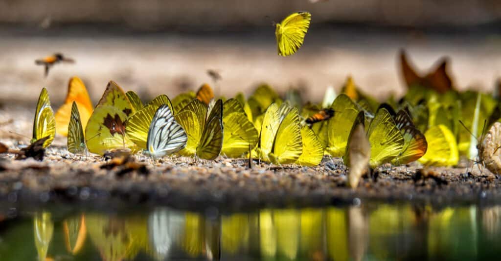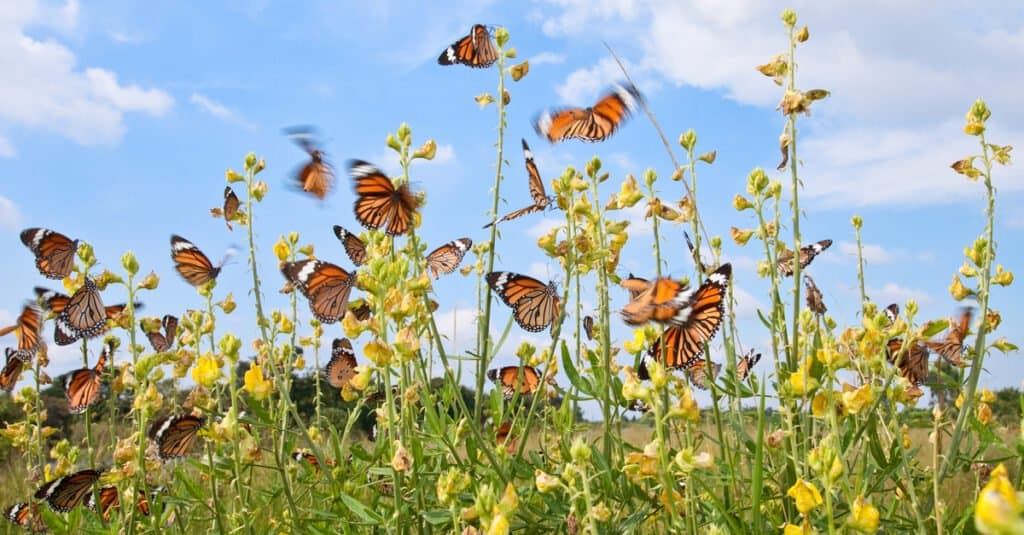 Se vedi un gruppo di farfalle, è un’esperienza accattivante e impressionante! Sono più spesso visti insieme su un albero o un altro oggetto dove riposano durante la migrazione, come dal Messico negli Stati Uniti o in Canada. O forse hanno trovato una rilassante pozzanghera d’acqua da cui molti possono bere contemporaneamente, proprio come fanno spesso le farfalle dal muso americano mentre migrano da regioni di siccità.