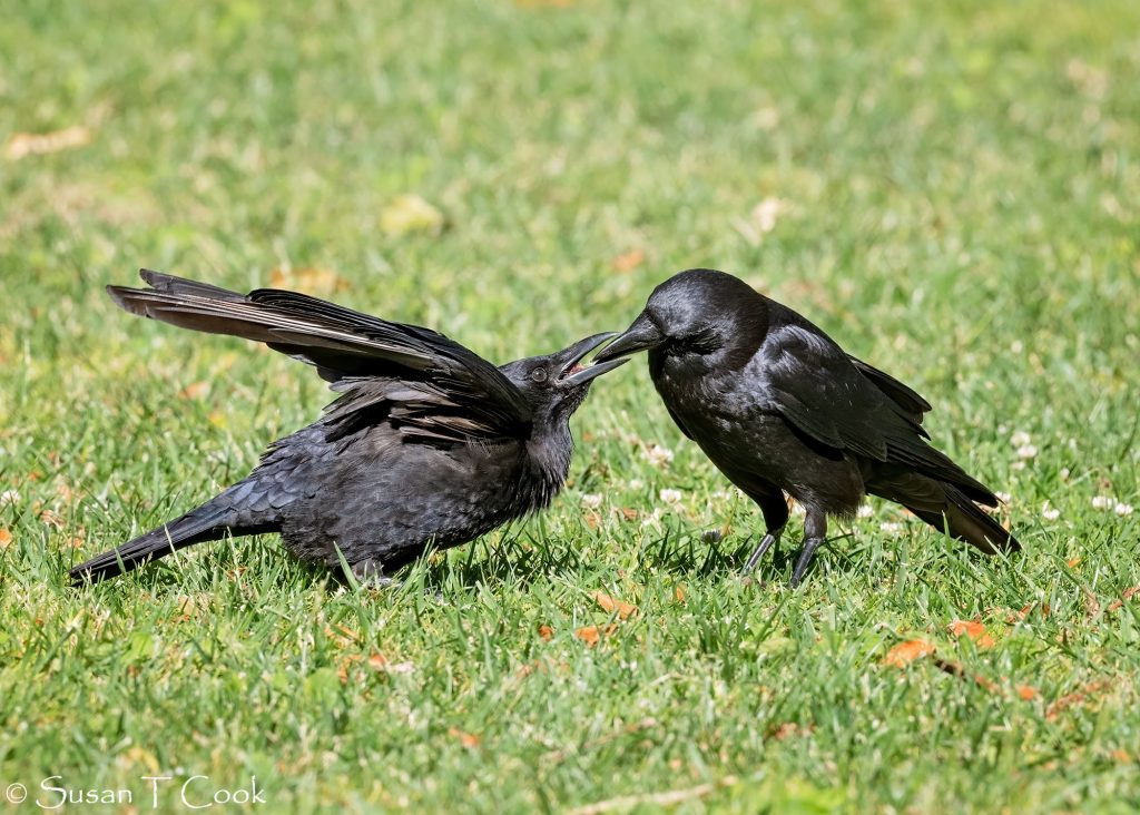 Come molti altri uccelli alle prime armi, i giovani corvi ricevono ancora il cibo dai genitori.