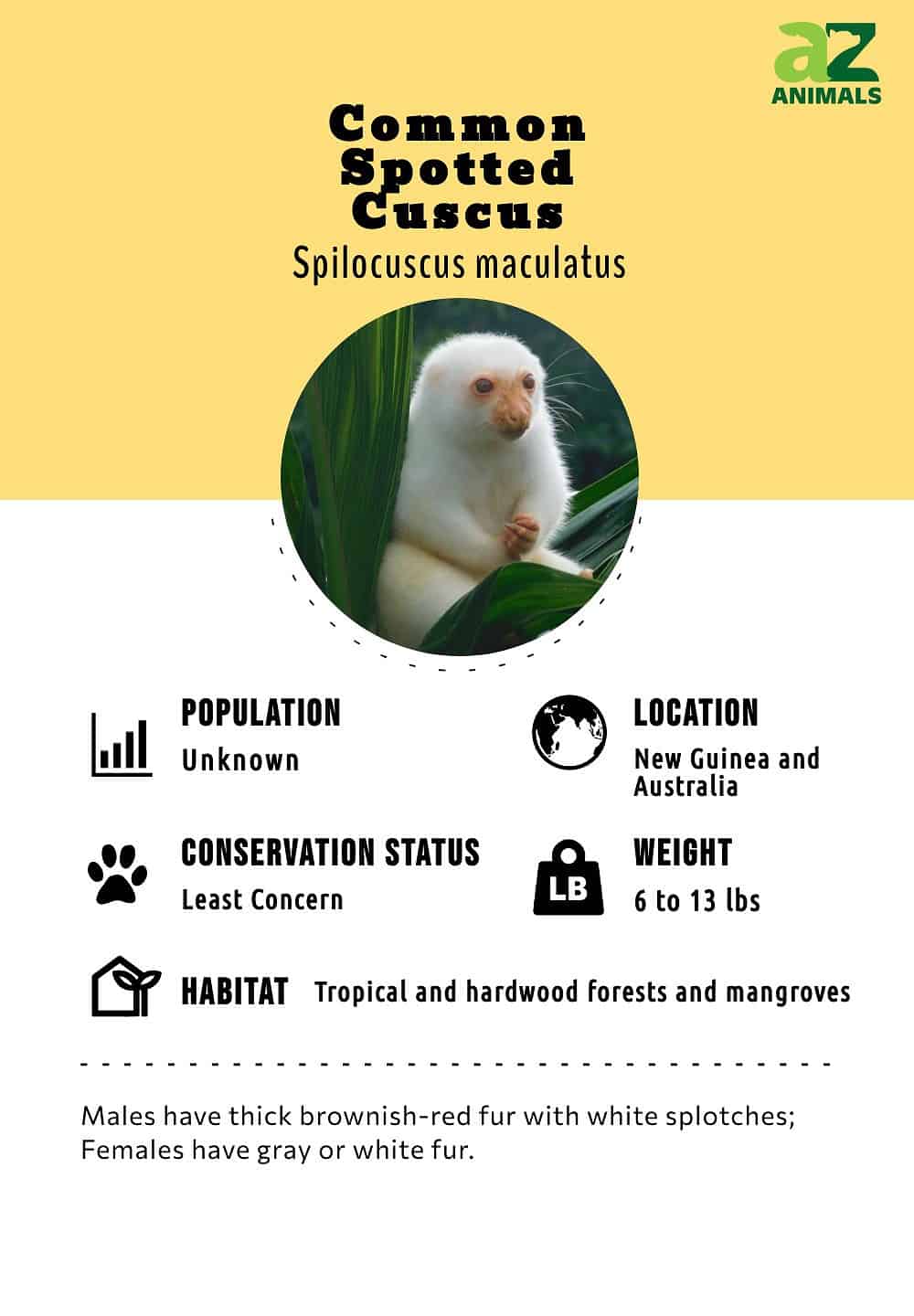 Il cuscus maculato comune è un grande opossum che vive nelle foreste tropicali di pianura della Nuova Guinea. Questo animale è un erbivoro con una dieta di diversi tipi di foglie. Una femmina ha una borsa per trasportare i suoi piccoli come un canguro. La pronuncia di cuscus suona come cuss-cuss. Questo animale vive fino a 11 anni in natura.