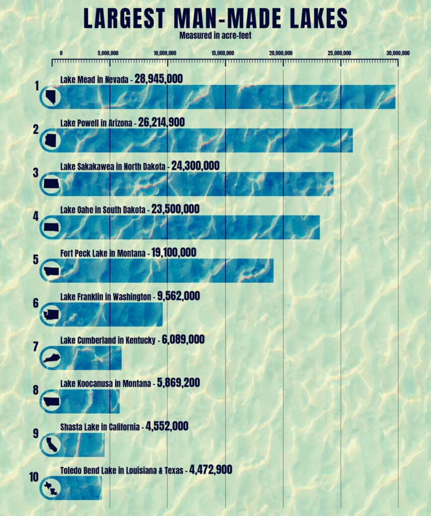 • Ci sono più di 53.000 laghi artificiali negli Stati Uniti, quasi pari alla percentuale dei suoi laghi naturali.