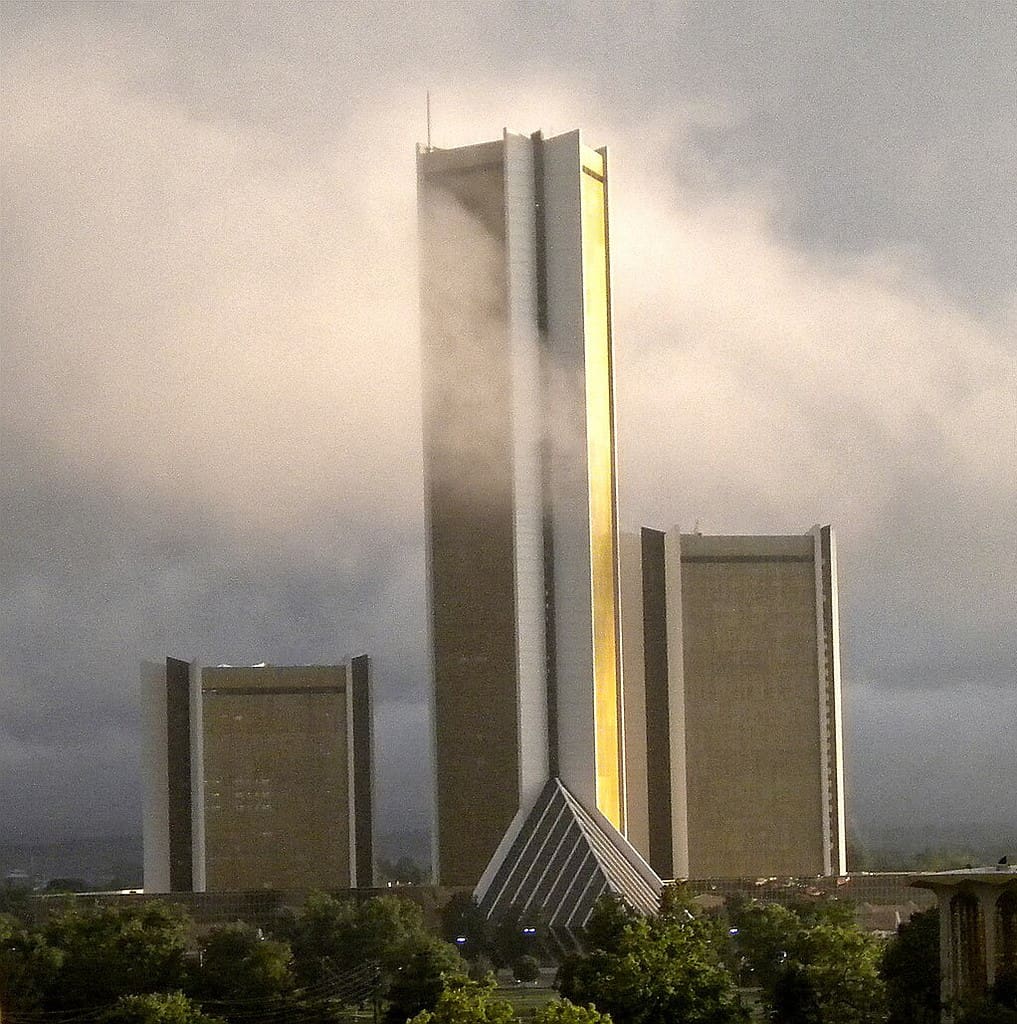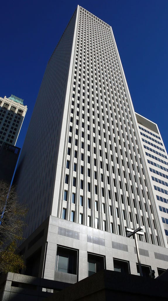 Puoi individuare il First National Center lungo lo skyline di Oklahoma City grazie alla sua architettura unica del tetto. C’è un alto pilastro al centro del tetto, che si protende verso il cielo.
