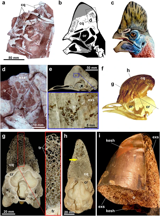 Confronta questo con l’immagine F, che mostra un moderno teschio di casuario. È straordinariamente simile! Le 3 immagini in basso confrontano la cresta sulla sommità del cranio di un casuario con la cresta del dinosauro estinto. Mostra che i materiali sono estremamente simili!