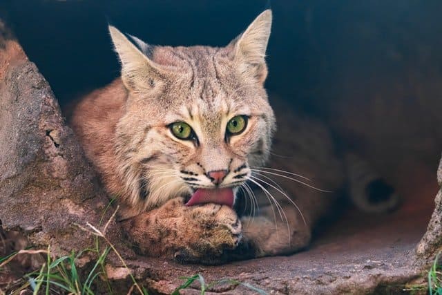 Anche i gatti selvatici fanno le loro tane nelle caverne, vicino e sotto le sporgenze. Tendono anche a selezionare posizioni vicino a fonti d’acqua. Le linci femmine possono anche allestire tane più elaborate per la massima protezione dei loro cuccioli. Le femmine usano spesso tronchi cavi, radici di alberi caduti o ripari rocciosi per proteggere i loro cuccioli. Può aggiungere muschio e foglie secche per rendere la tana più confortevole per i suoi gattini.
