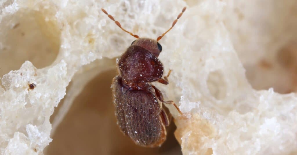 - Scarabeo di mobili comune: Il comune scarabeo dei mobili, che misura circa quattro millimetri, assomiglia molto allo scarabeo dei biscotti, tranne per il fatto che ha un “cappuccio da monaco” che copre la testa. La differenza principale è che i coleotteri dei mobili, fedeli al loro nome, infestano il legno invece del cibo. Dopo l’accoppiamento, le femmine depongono le uova direttamente nelle fessure o nei buchi del legno. Quando le larve bianche a forma di C si schiudono, scavano nel legno per nutrirsi. Questa fase della vita può durare dai tre ai quattro anni prima che diventino adulti. Nonostante il nome, infestano anche pavimenti e pareti.