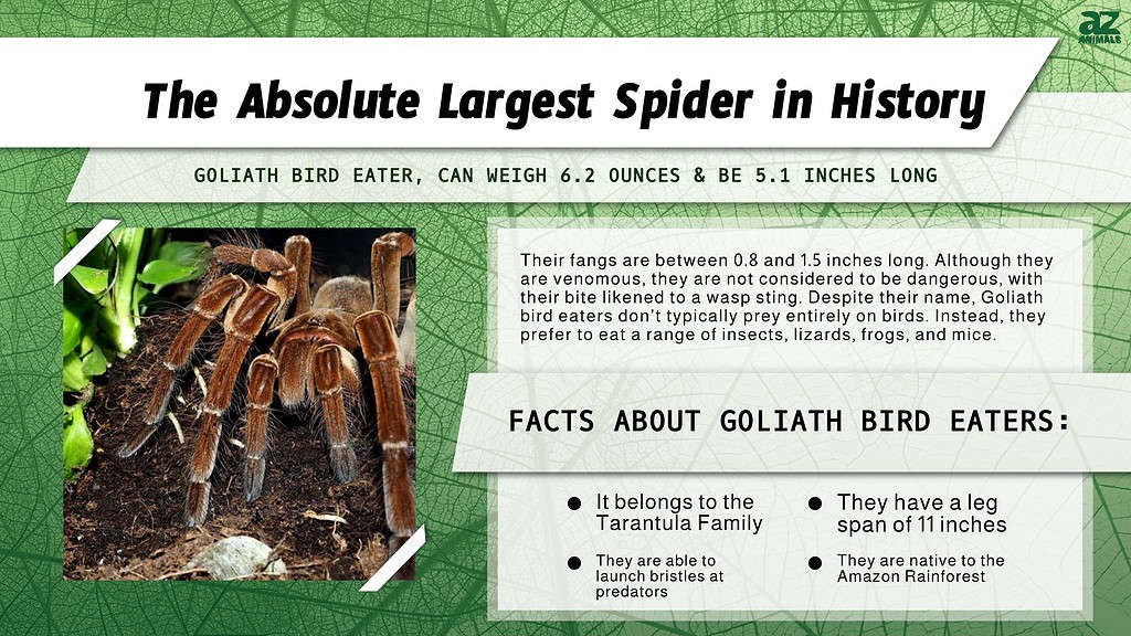 Il ragno più grande della storia è il mangiatore di uccelli Goliath (Theraphosa blondi), qual è il ragno più grande vivente oggi per lunghezza e peso. Pesa circa 6,2 once e può raggiungere lunghezze corporee fino a un incredibile 5,1 pollici, il che lo rende facilmente uno dei ragni più temibili e intimidatori del mondo. Ha anche un’apertura delle zampe fino a 11 pollici ed è solitamente di colore marrone chiaro o marrone chiaro. I mangiatori di uccelli Golia sono originari del Sud America, in particolare della foresta pluviale amazzonica, e vivono in tane vicino a paludi o acquitrini.