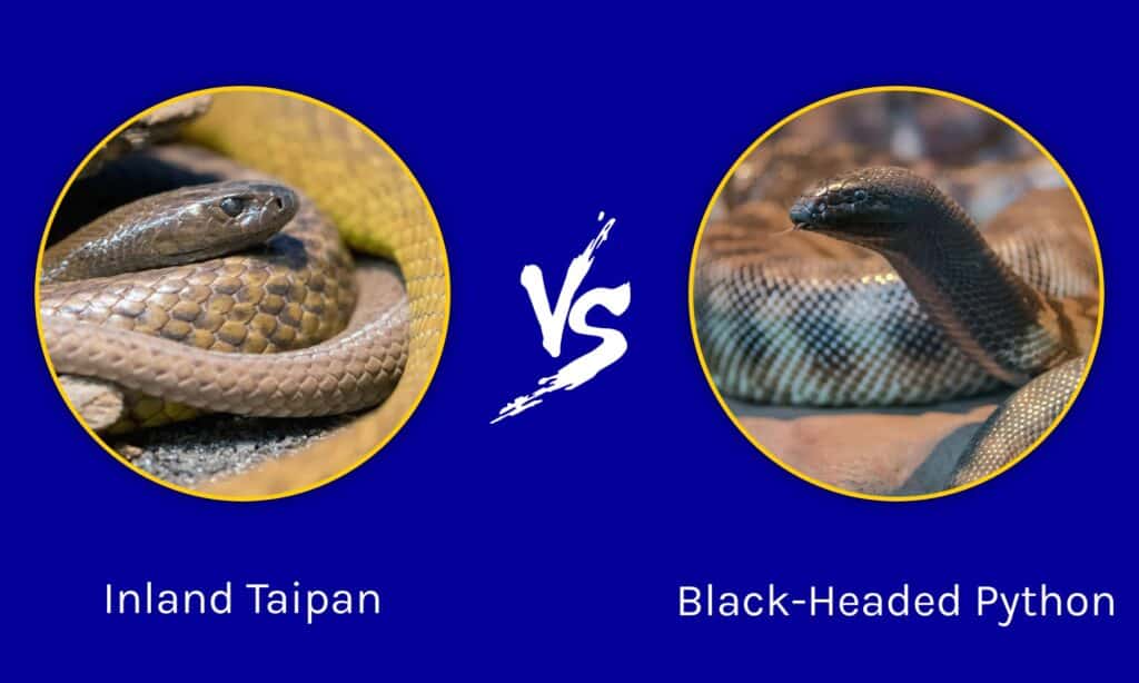 Un pitone dalla testa nera vincerebbe un combattimento contro un taipan dell’entroterra. Il taipan dell’entroterra è altamente velenoso, ma il pitone dalla testa nera ha una resistenza sufficiente per prendere i suoi morsi. Sebbene il pitone dalla testa nera possa alla fine soccombere al veleno, avrà tempo più che sufficiente per costringere e uccidere il taipan.