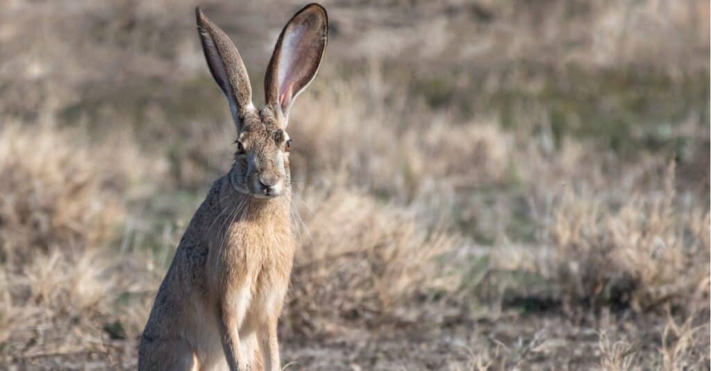 A black-tailed jackrabbit is a hare found in the south and western parts of the United States as well as in Mexico. Along with having a black tail, this hare has fur colors of grayish-brown on most of its body with white fur on its face. It’s an herbivore eating grass, bark, cacti, and twigs. The lifespan of this hare is five to eight years.