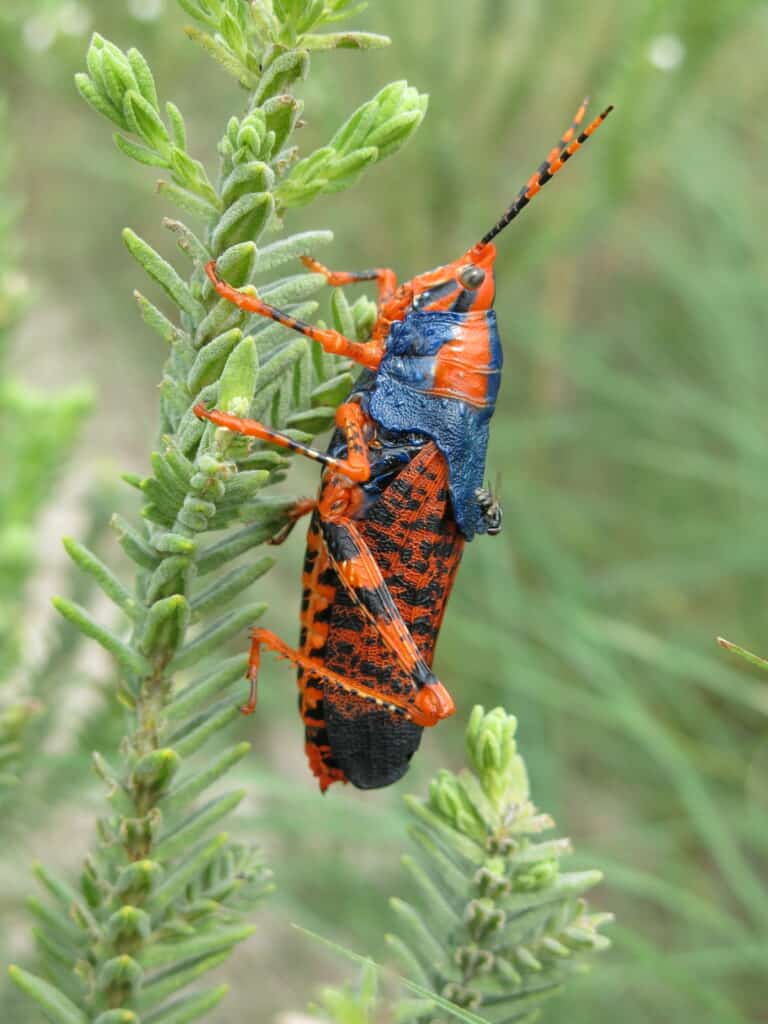 Le cavallette di Leichhardt sono facilmente identificabili grazie ai loro brillanti colori arancione e blu.
