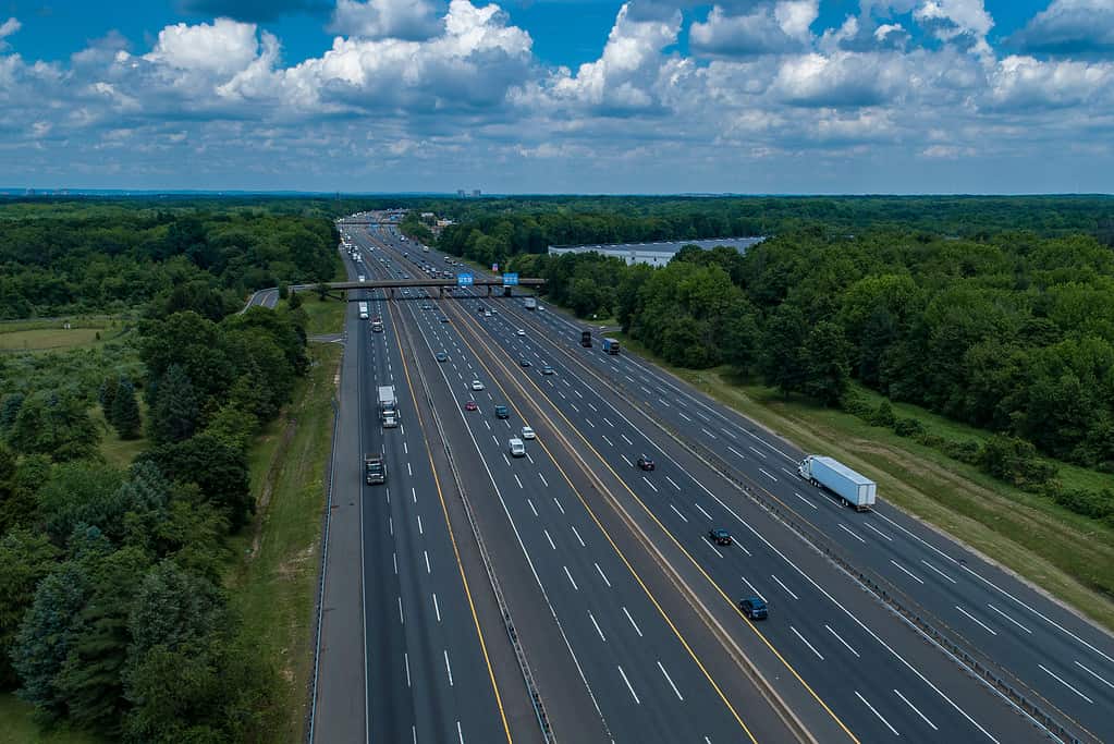 L’autostrada del New Jersey e le sue 12 corsie, configurazione dual-dual guardando a nord a South Brunswick, New Jersey.