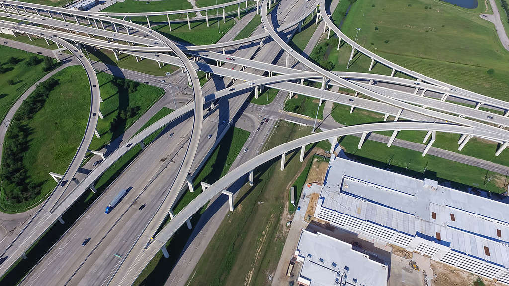 ©Vista aerea Interstate 10 o Katy freeway con intersezione massiccia, interscambio di pile, cavalcavia sopraelevato di giunzione stradale durante il giorno/Shutterstock.com