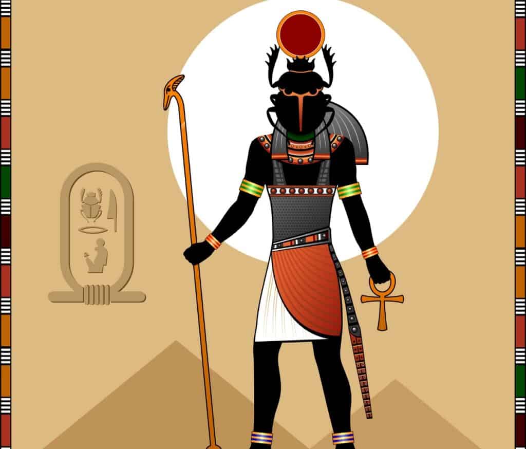 Khepri era considerato un dio “insetto” ed era raffigurato con uno scarabeo stercorario come testa in antichi disegni. Gli egizi collegavano il movimento del sole con le palle di sterco spinte dallo scarabeo egiziano e le antenne dello scarabeo sulla sua testa assomigliavano al disco solare fiancheggiato da corna indossate da numerose divinità.