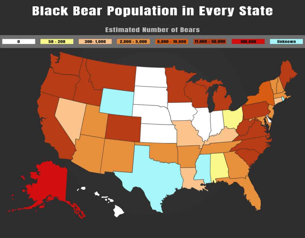 • La popolazione complessiva di orsi neri americani negli Stati Uniti varia da 250.000 a oltre 300.000.