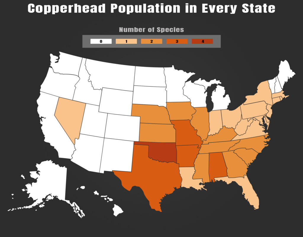 Questa mappa rivela la popolazione di serpenti testa di rame per stato.