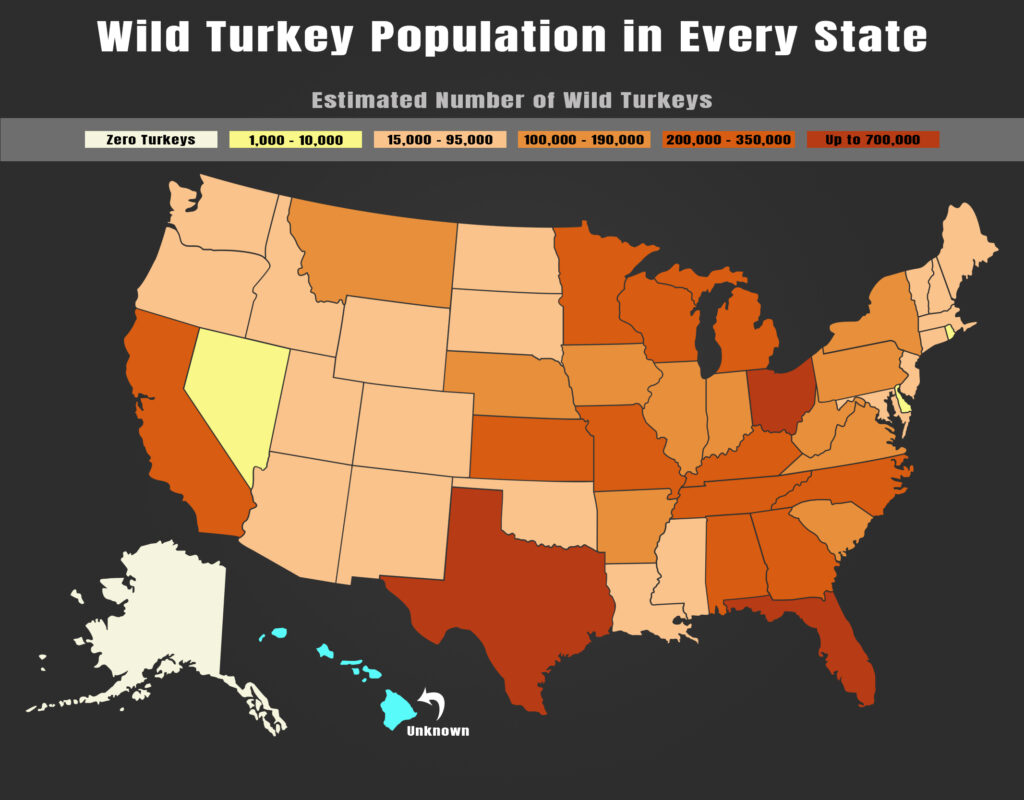 - Quasi tutti gli stati hanno almeno alcune popolazioni di tacchini, con l’unica eccezione principale dell’Alaska.