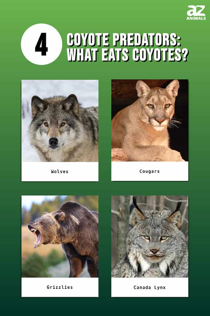 I coyote vengono mangiati dai lupi grigi, dai puma, dagli orsi neri e grizzly americani, dagli alligatori americani, dalle grandi linci canadesi e dalle aquile reali. Nonostante siano predatori feroci e abili nella caccia, i coyote conoscono il loro posto quando si tratta della catena alimentare naturale. Sebbene sembrino dominanti quando hanno a che fare con le loro prede, sono vulnerabili quando incrociano predatori come lupi e puma.