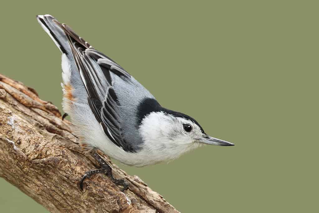 Come identificare: Un piccolo uccello canterino con una grande testa, il picchio muratore dal petto bianco ha code corte e becco lungo. Hanno dorsi grigio-bluastri, parti inferiori e gole bianche e cappucci neri.
