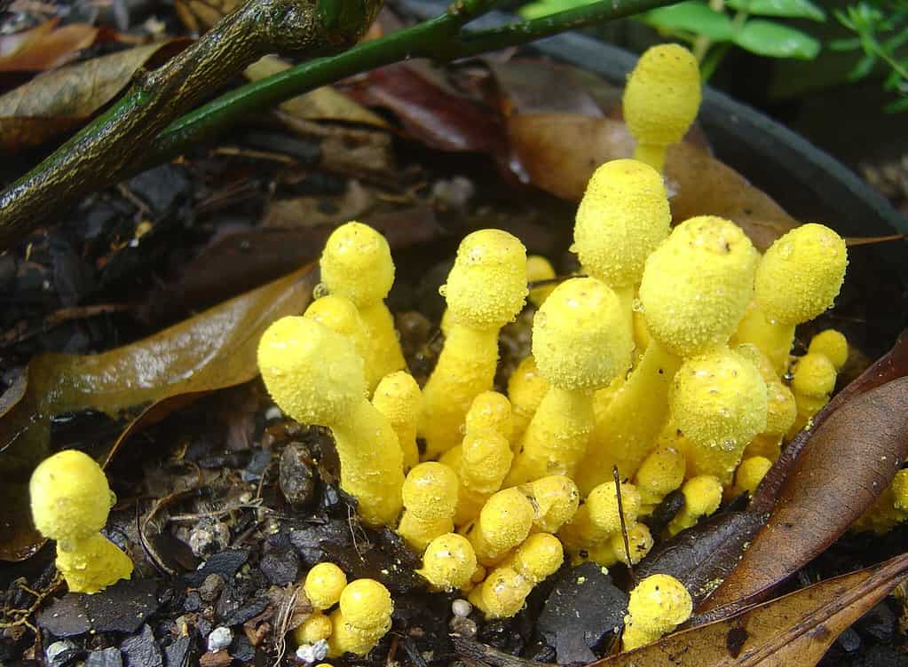 I giardini nei climi tropicali e caldi – o le serre umide – possono trovare questi funghi giallo brillante nel loro terreno.