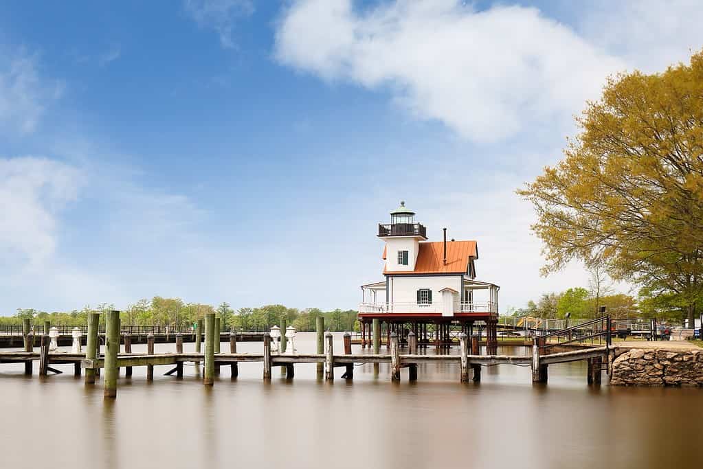 • Il faro del fiume Roanoke, attivo dal 1887 al 1941, è l’ultimo esempio nel paese di un edificio a struttura rettangolare costruito su una base a pali elicoidali per stabilità durante gli uragani.