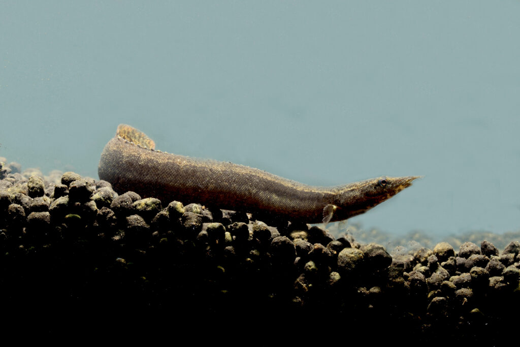 L’anguilla spinosa dell’Eufrate ha un muso appuntito e bande più scure su tutta la lunghezza del corpo.