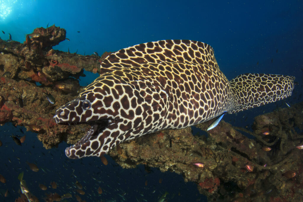 Le murene Honeycomb hanno un distinto motivo a nido d’ape marrone scuro con un colore di sfondo più chiaro.