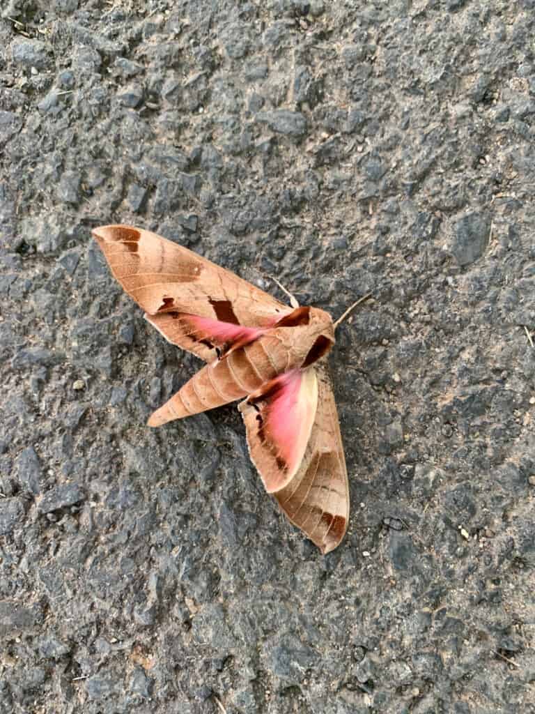 Le falene della sfinge Achemon hanno ali anteriori bruno-rosate con una macchia quadrata e ali posteriori rosa con segni marroni.