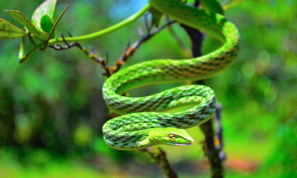 Luminoso Oxybelis è il più grande serpente di vite. Conosciuto anche come serpente di pane piatto o serpente di vite verde, Luminoso Oxybelis è un serpente colubride arboreo snello e allungato. È comunemente chiamato serpente dal becco, vite, bejuquilla verdee bejuca lora in Sud America. Questo serpente viene spesso scambiato per le specie di colore verde del genere Aetullache sono anche chiamati “serpenti di vite verde”.