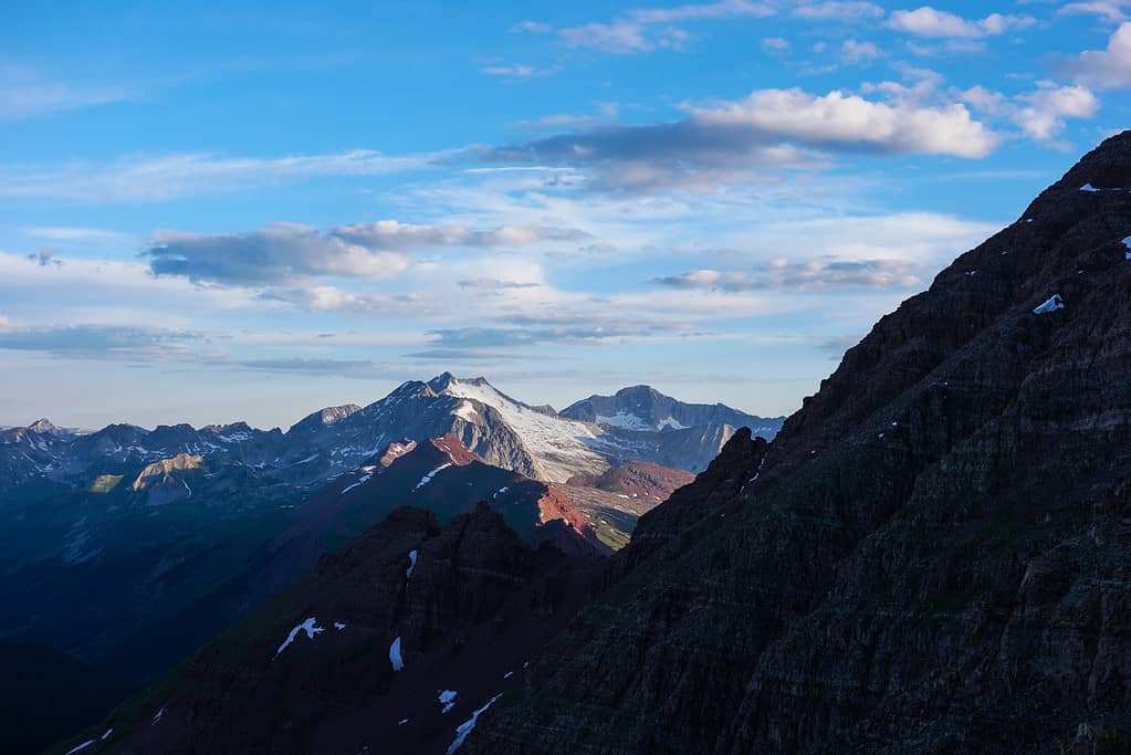Il North Maroon Peak si trova ai piedi 14,014 e il suo percorso standard è solitamente coperto di neve o ghiaccio, il che rende difficile seguire il sentiero. La cresta meridionale delle Maroon Bells è più ripida e faticosa, con valli strette e pericolosi percorsi di valanghe.