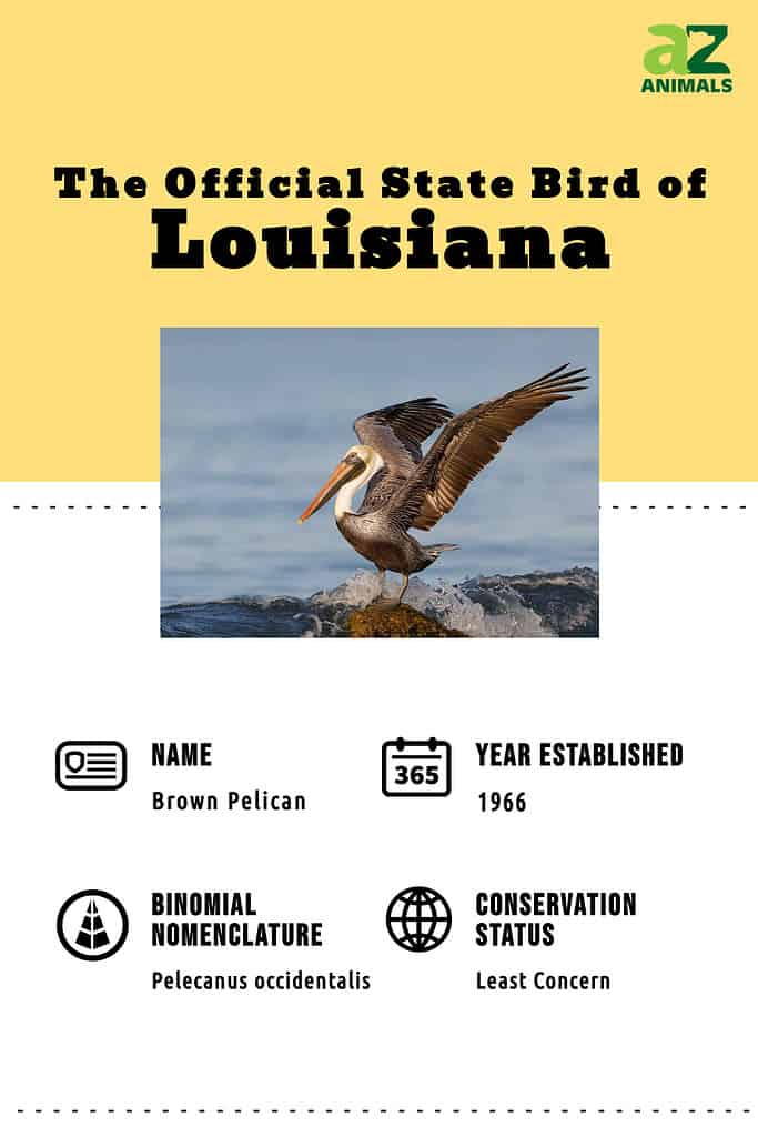L’uccello ufficiale dello stato della Louisiana è il pellicano bruno (Pelecanus occidentalis). Il legislatore della Louisiana ha adottato ufficialmente il pellicano bruno il 27 luglio 1966. Nessun altro stato ha scelto il pellicano bruno come uccello ufficiale dello stato. Molti animali vivono in Louisiana, ma lo stato ha un orgoglioso legame con i pellicani che vivono lungo le sue vaste coste. La Louisiana, spesso chiamata lo Stato del Pellicano, utilizza persino i simboli del pellicano sulla bandiera dello stato e sul quarto di stato prodotto dalla Zecca degli Stati Uniti.