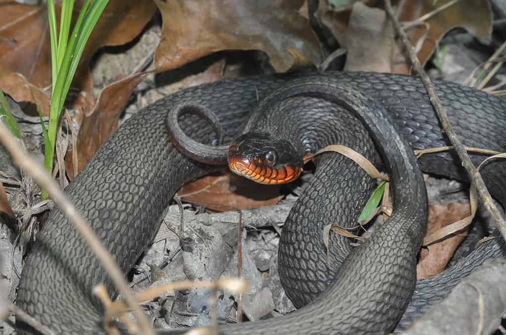 Serpente d’acqua dal ventre giallo, Nerodia erythrogaster flavigaster, tra alcune foglie cadute nella Shawnee National Forest.
