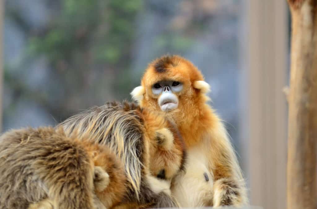 Successivamente, abbiamo la scimmia dal naso camuso dorato, una scimmia del Vecchio Mondo originaria delle foreste montuose della Cina centrale e sud-occidentale. Queste scimmie possono sopravvivere ad altitudini fino a 11.200 piedi. Sono una specie in via di estinzione e facile da distinguere dalle altre scimmie. Le scimmie dal naso camuso dorato hanno un aspetto unico. I peli sui loro corpi differiscono per colore e lunghezza. Ad esempio, hanno peli di guardia dorati sulla schiena e sull’area del mantello, ma capelli castano scuro sulle braccia, sull’esterno delle cosce e sulla corona della nuca. Le scimmie dal naso camuso dorato vivono in complessi gruppi sociali. Ad esempio, alcune scimmie dal naso camuso dorato vivono in gruppi da 5 a 10, mentre altre vivono in bande di circa 600.