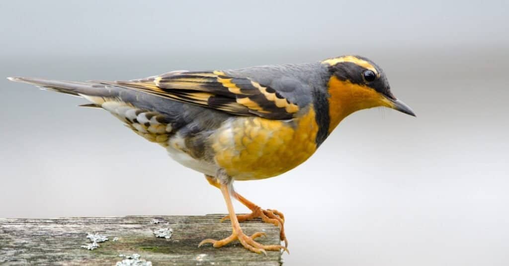 Da lontano, il variegato tordo appare nero e arancione, ma da vicino puoi vedere che il loro piumaggio è in realtà grigio-bluastro scuro e arancione bruciato. Sembrano fortemente striati con teste grandi e rotonde e becchi dritti. Vivono in foreste scure e umide mature del nord-ovest del Pacifico, con molte popolazioni che rimangono tutto l’anno. Quelli che si riproducono in Canada migrano fino alla California meridionale durante l’inverno. Puoi anche individuarli in parchi, giardini e rive del lago.