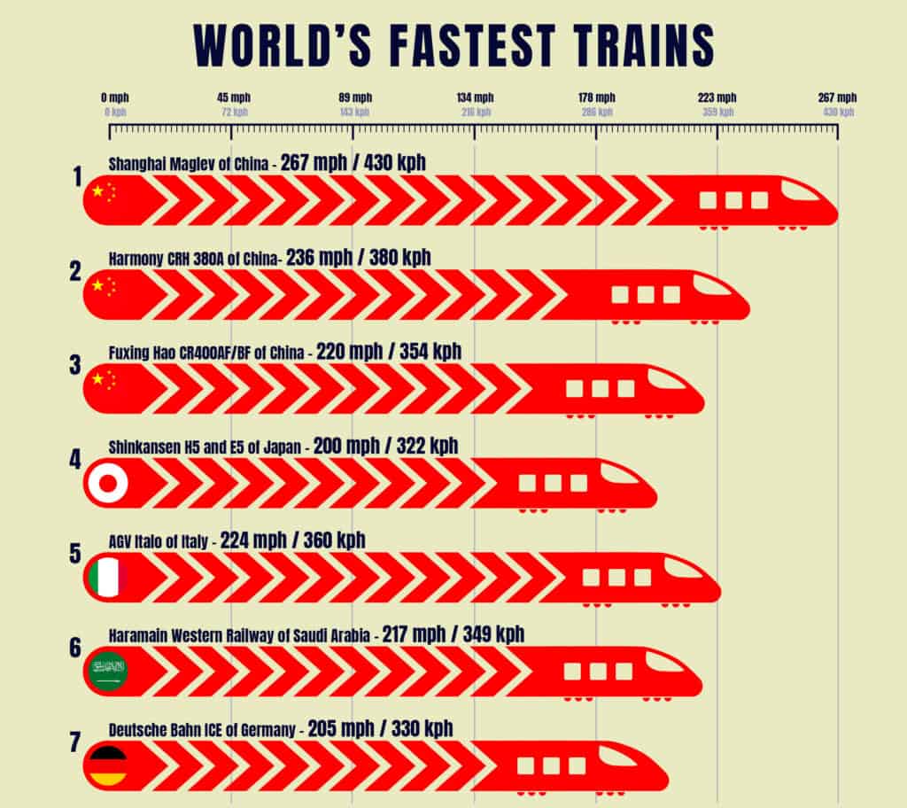 La Cina ha la più grande rete ferroviaria ad alta velocità, incluso il treno più veloce del mondo. A partire dal 2018, vantava 17.000 miglia di ferrovia ad alta velocità, il 60% del totale mondiale. I treni veloci si possono trovare anche in Europa e in Asia. Oltre alla velocità, ci sono altri motivi per cui le persone viaggiano su un treno.