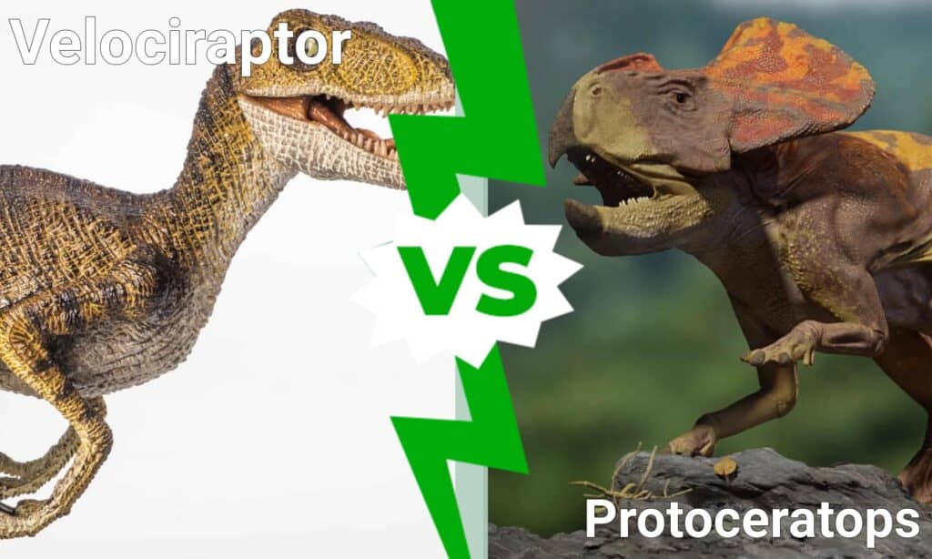 Il Velociraptor vincerebbe un combattimento contro un Protoceratops. In effetti, i reperti fossili hanno mostrato che un Velociraptor aveva usato i suoi lunghi artigli per scavare nel collo di un Protoceratops prima che entrambi venissero uccisi dal crollo di una duna di sabbia. Altri documenti hanno dimostrato che i Velociraptor predavano attivamente Protoceratops.